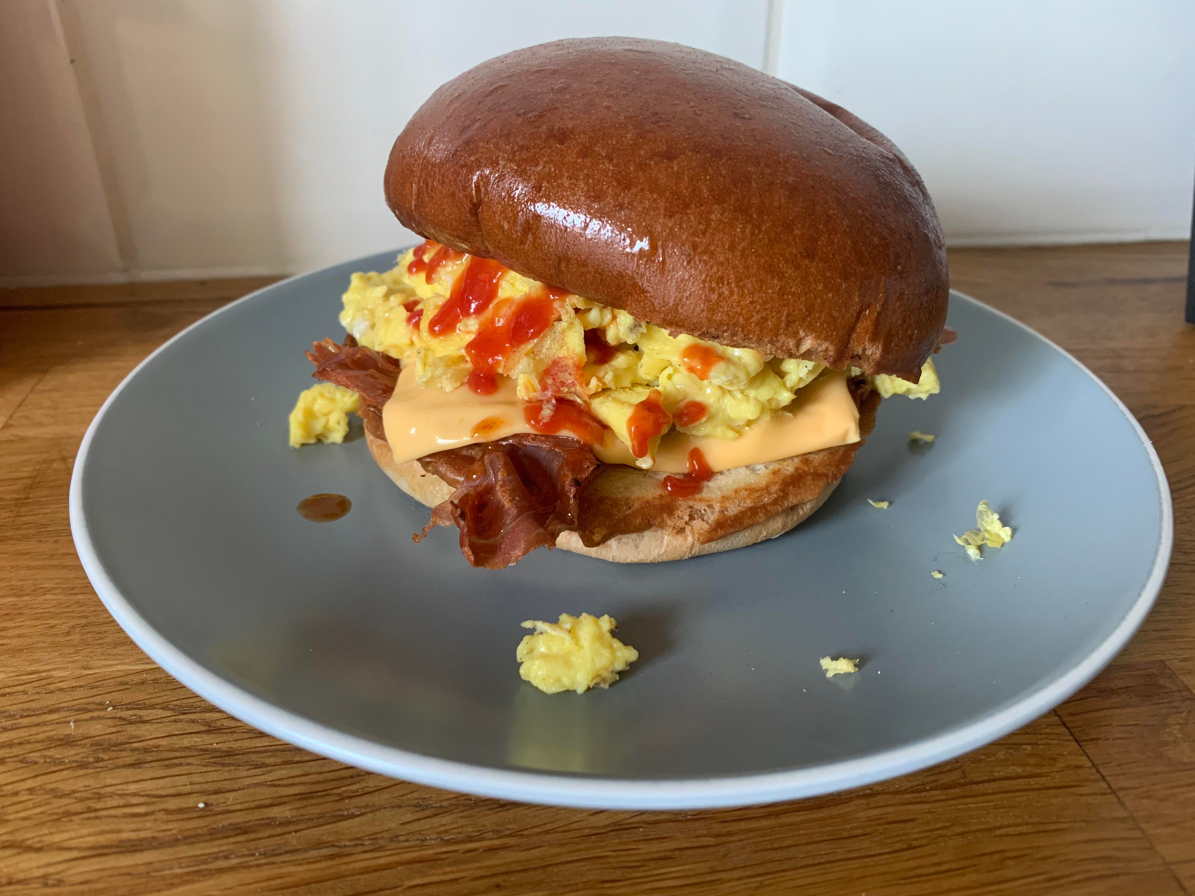 Scrambled Eggs American Fried Parma Ham Ketchup Chipotle Hot Sauce On Brioche Bun Dining And Cooking